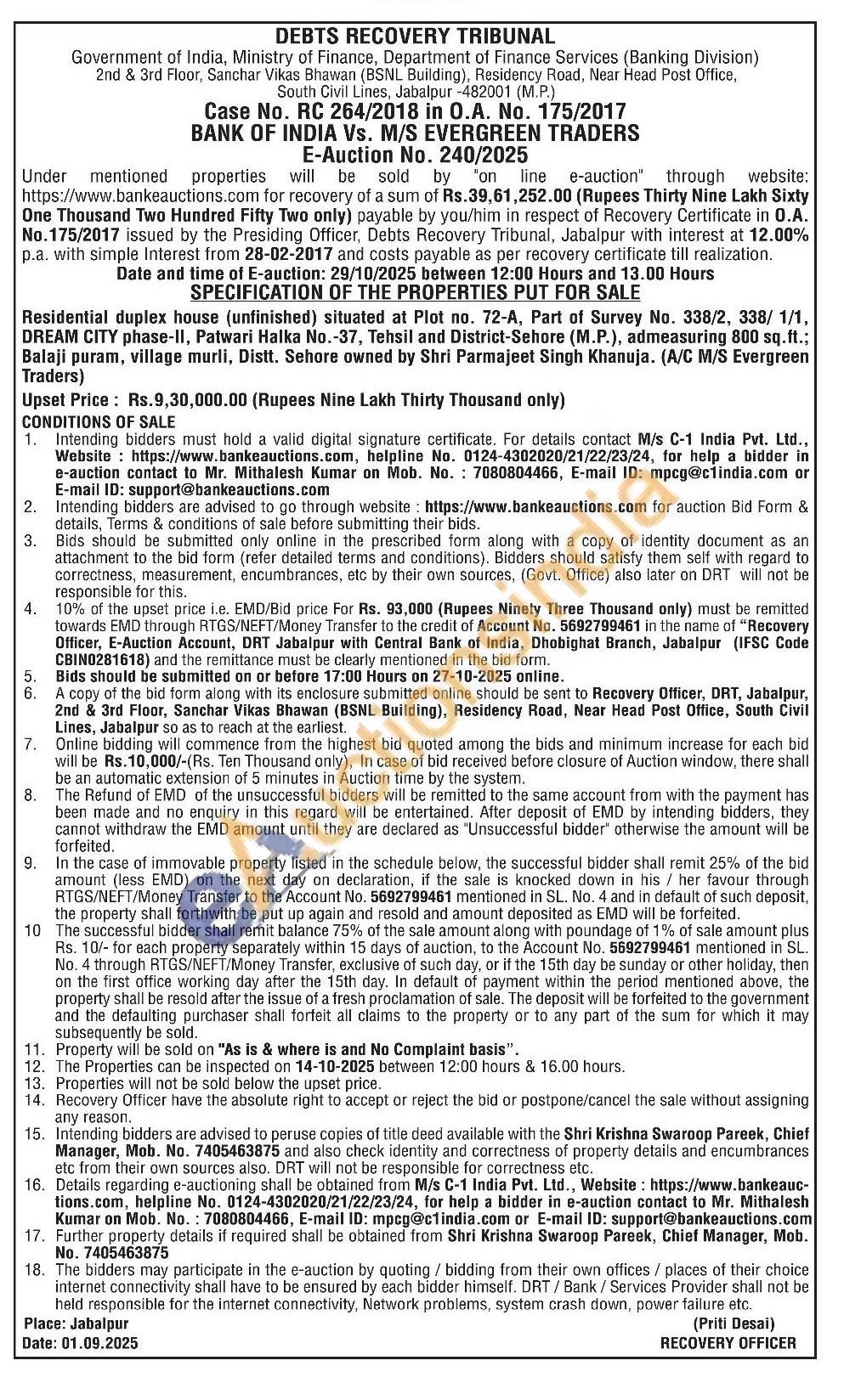 Residential duplex house (unfinished) situated at Plot no. 72-A, Part of Survey No. 338/2, 338/1/1, DREAM CITY phase-II, Patwari Halka No.-37, Tehsil and District-Sehore (M.P.), admeasuring 800 sq.ft.; Balaji puram, village murli, Distt. Sehore owned by Shri Parmajeet Singh Khanuja. (A/C M/S Evergreen Traders)