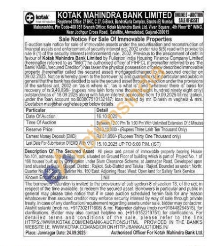 Description Of The Secured Asset All piece and parcel of immovable property bearing House No. 101, admeasuring 40.78sq mitrs situated on Ground Floor of building which is part of Project No. 1 of 166 houses built up by Corporation under Slum Clearance Scheme, at Jamnagar Road, Developed upon land situated in State Gujarat District Rajkot, Sub-District and Taluka: Rajkot Bounded as under: North: Quarter No. 148 South: Quarter No. 150 East: Adjoining Road West: Open land for Safety Tank Service