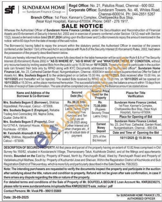 DESCRIPTION OF SECURED PROPERTY: All that piece and parcel of the property having an extent of 10.82 Ares comprised in Old Survey No 150/82, situated in Koodaranchi Village, Thamarassery Taluk, Kozhikode District, and all the fittings and appurtenants thereto, Bounded on the East by: Property of Prasad, North by: Panchayath Road, West by. Panchayath Road and Property of Vadakkekuzhiyil Mathew, South by: Property of Kuzhumbil Jose and Shelvan. Within the Registration District of Kozhikode and Sub Registration District of Thiruvambay, which is more fully and particularly described in the Sale Deed No.758/2023