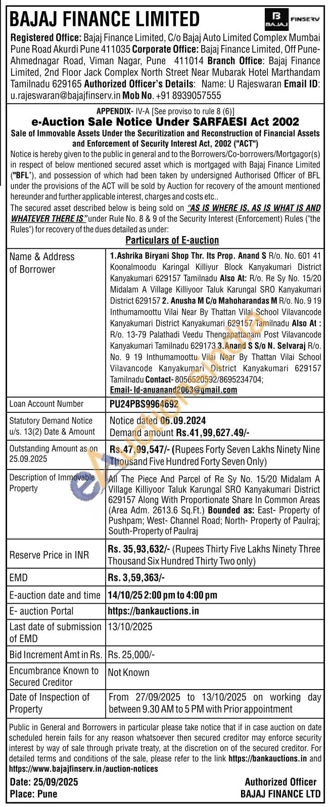 Authorized Officer's Details : U Rajeswaran Mobile No : +91 8939057555