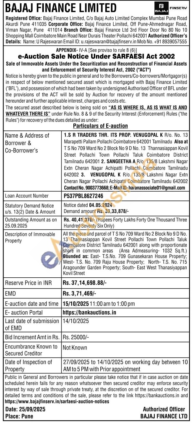 All the piece and parcel of T S No 709 Ward No 2 Block No 9 D No. 13 Thannasiappan Kovil Street Pollachi Town Pollachi Taluk Coimbatore District Tamilnadu 642001 along with proportionate share in common areas (Area Admeasuring- 1032 Sq.ft.) Bounded as: East- T.S.No. 709 Gunasekaran House Property; West- T.S. No. 709 Raju House Property; North- T.S. No. 715 Aragounder Garden Property; South-East West Thanasiyappan Kovil Street