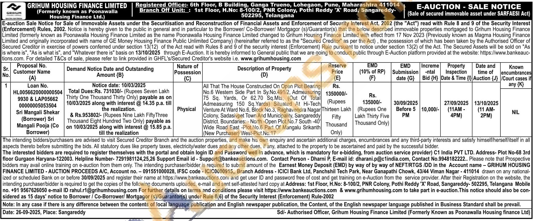 All That The House Constructed On Open Plot Bearing No.6 Western Side Part In Sy.No.491/2, Admeasuring 75 Sq. Yards, Or 62.70 Sq.Mts, (Out Of Total Admeasuring 150 Sq. Yards) Situated At Hi-Tech Venture At Ward No.6, Block No.3, Raghavendra Nagar Colony, Sadasivpet Town And Municipality, Sangareddy District. Boundaries: - North-Open Plot. No.7 South -40' Wide Road East -Plot.No.6 Part Of Mangalu Srikanth (New Purchaser) West-Plot.No.17