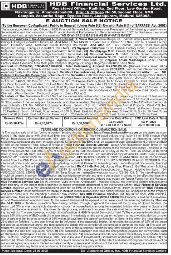 Details of Immovable Properties: Schedule of The Securities I: All That Piece And Parcel Of In Dindigul Registration District, Nagalanayakanpatti Sub Registration District, Dindigul Town Survey Ward No. 5, Mettupatti, Terkur Extension House Situates In T.S. No. 1466/9, Old Door No. 151, Now Door No. 73, Enamel Factory Road, To An Extent Of 1025 Sq. Feet Measurement Of-West 1st Portion East West: 25 Feet North South: 14 Feet To An Extent Of 360 Sq. Feet East 2nd Portion East West: 5 Feet North South: 18 Feet To An Extent Of 90 Sq. Feet East 3rd Portion East West: 26 Feet North South: 22 1/2 Feet To An Extent Of 585 Sq. Feet In Total Extent Of 1025 Sq Feet within the boundaries of North-20 Feet wide road, South Raja Channal, West-Southern Portion of property East-Plot no 2.