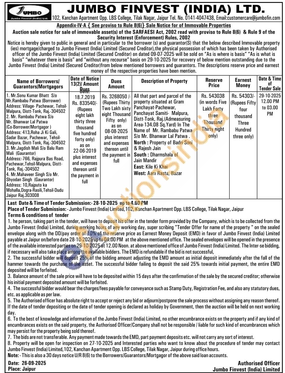 All that part and parcel of the property situated at Gram Panchayat-Pachewar, Panchayat Samiti Malpura, Distt-Tonk, Raj. (Admeasuring Area-134.08 Sq. Yard) In The Name of Mr. Rambabu Patwa S/o Mr. Bhanwar Lal Patwa