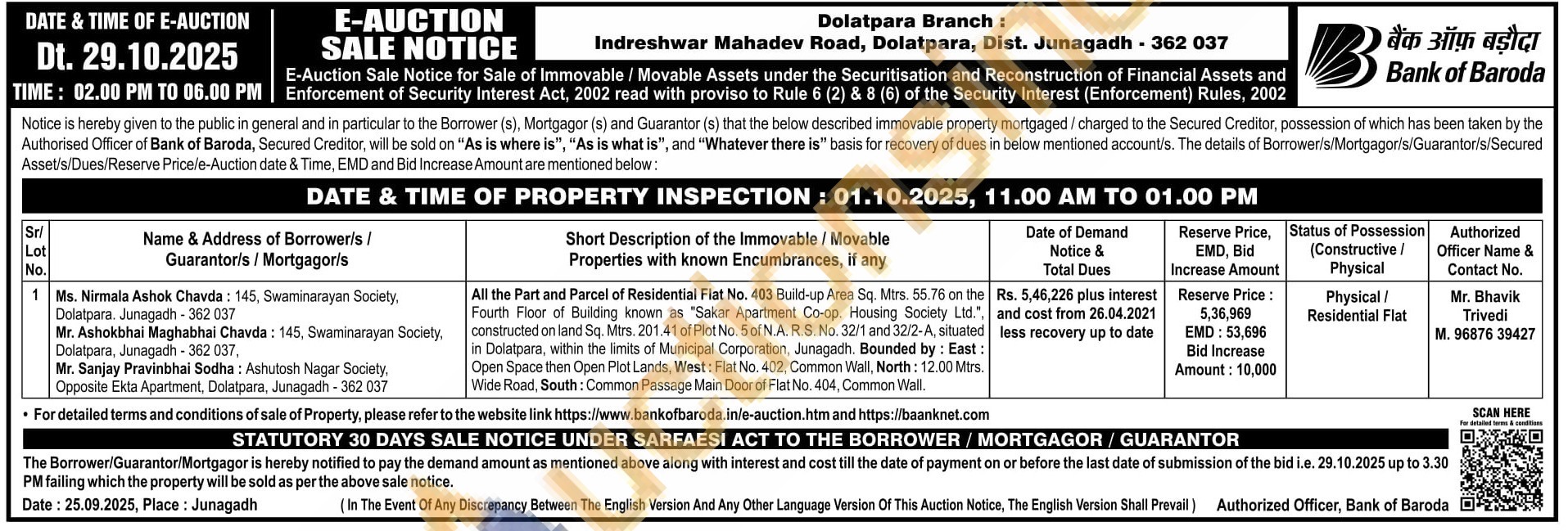 All the Part and Parcel of Residential Flat No. 403 Build-up Area Sq. Mtrs. 55.76 on the Fourth Floor of Building known as "Sakar Apartment Co-op. Housing Society Ltd., constructed on land Sq. Mtrs. 201.41 of Plot No. 5 of N.A. R.S. No. 32/1 and 32/2-A, situated in Dolatpara, within the limits of Municipal Corporation, Junagadh. Bounded by: East: Open Space then Open Plot Lands, West: Flat No. 402. Common Wall, North: 12.00 Mirs. Wide Road, South: Common Passage Main Door of Flat No. 404, Common