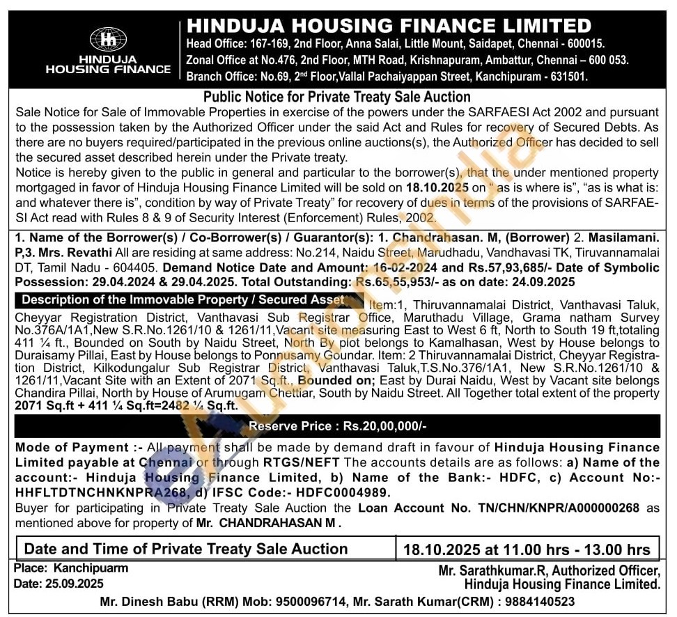 Item:1, Thiruvannamalai District, Vanthavasi Taluk, Cheyyar Registration District, Vanthavasi Sub Registrar Office, Maruthadu Village, Grama natham Survey No.376A/1A1, New S.R.No. 1261/10 & 1261/11, Vacant site measuring East to West 6 ft, North to South 19 ft, totaling 411 ¼ ft., Bounded on South by Naidu Street, North By plot belongs to Kamalhasan, West by House belongs to Duraisamy Pillai, East by House belongs to Ponnusamy Goundar. Item: 2 Thiruvannamalai District, Cheyyar Registra-tion District, Kilkodungalur Sub Registrar District, Vanthavasi Taluk, T.S.No.376/1A1, New S.R.No.1261/10 & 1261/11, Vacant Site with an Extent of 2071 Sq.ft., Bounded on; East by Durai Naidu, West by Vacant site belongs Chandira Pillai, North by House of Arumugam Chettiar, South by Naidu Street. All Together total extent of the property 2071 Sq.ft + 411 Sq.ft=2482 1½ Sq.ft.