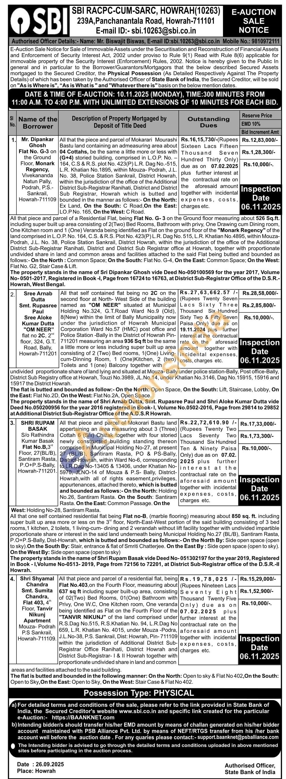 All that piece and parcel of a residential flat, being Flat No.403,on the Fourth Floor, measuring about 637 sq ft including super built-up area, consisting of 02(Two) Bed Rooms, 01(One) Bathroom with Privy, One W.C, One Kitchen room, One veranda being identified as Flat on the Fourth Floor of the "TANVIR NIKUNJ" of the land comprised under R.S.Dag No.515, R.S.Khatian No. 94, L.R.Dag No 659, L.R. Khatian No. 4015, under Mouza -Podra, . J.L.No-38, P.S. Sankrail, Dist: Howrah, Pin-711109 within the jurisdiction of Additional District Sub-Registrar Office Ranihati, District Howrah and District Sub-Registrar- I & II Howrah together with proportionate undivided share in land and common areas and facilities attached to the said building.