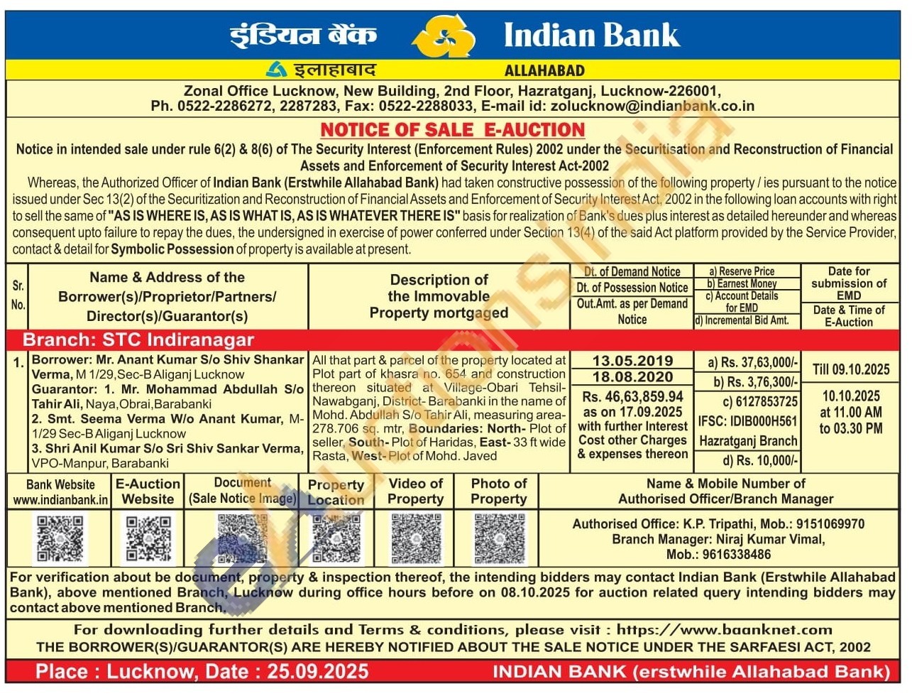 All that part & parcel of the property located at Plot part of khasra no. 654 and construction thereon situated at Village-Obari Tehsil-Nawabganj, District-Barabanki in the name of Mohd. Abdullah S/o Tahir Ali, measuring area-278.706 sq. mtr, Boundaries: North- Plot of seller, South-Plot of Haridas, East-33 ft wide Rasta, West-Plot of Mohd. Javed