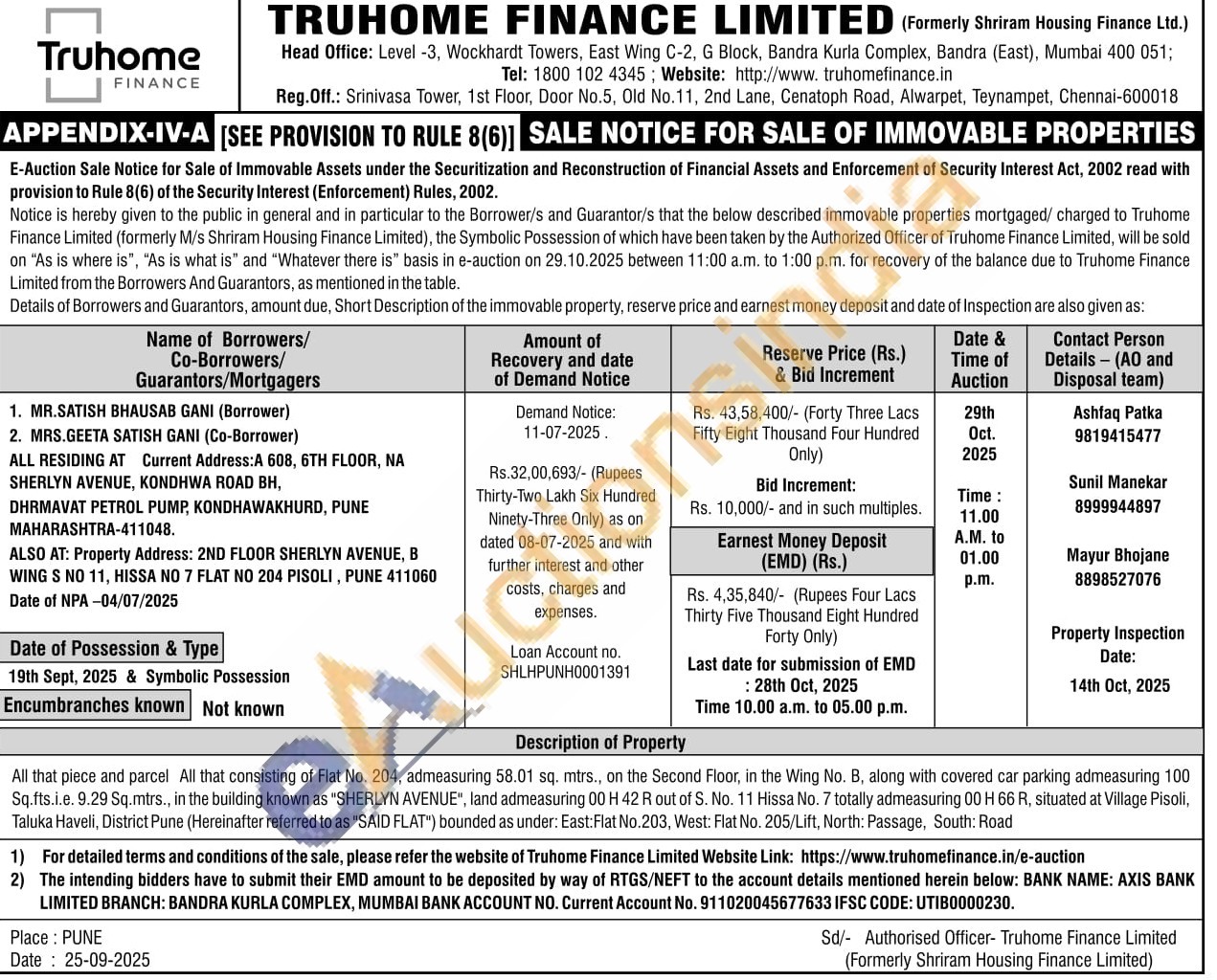 All that piece and parcel All that consisting of Flat No. 204, admeasuring 58.01 sq. mtrs., on the Second Floor, in the Wing No. B, along with covered car parking admeasuring 100 Sq.fts.i.e. 9.29 Sq.mtrs., in the building known as "SHERLYN AVENUE", land admeasuring 00 H 42 R out of S. No. 11 Hissa No. 7 totally admeasuring 00 H 66 R, situated at Village Pisoli, Taluka Haveli, District Pune (Hereinafter referred to as "SAID FLAT") bounded as under: East:Flat No.203, West: Flat No. 205/Lift, North: Passage, South: Road