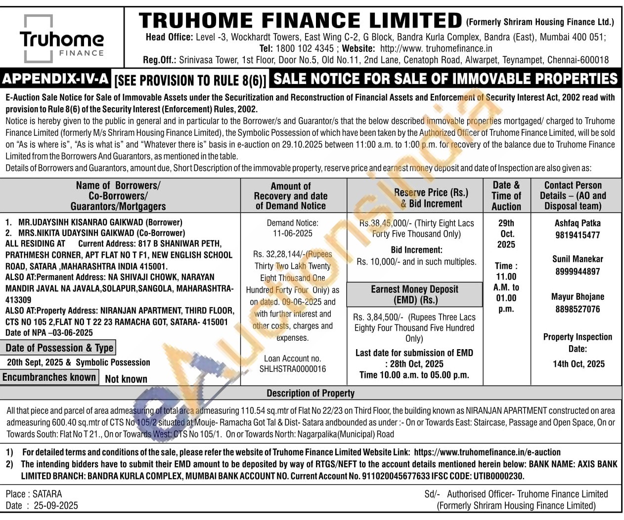 All that piece and parcel of area admeasuring of total area admeasuring 110.54 sq.mtr of Flat No 22/23 on Third Floor, the building known as NIRANJAN APARTMENT constructed on area admeasuring 600.40 sq.mtr of CTS No 105/2 situated at Mouje- Ramacha Got Tal & Dist- Satara andbounded as under :- On or Towards East: Staircase, Passage and Open Space, On or Towards South: Flat No T 21., On or Towards West: CTS No 105/1. On or Towards North: Nagarpalika (Municipal) Road