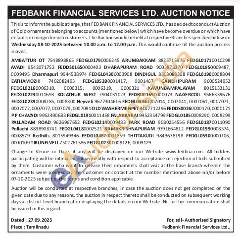Fedbank Financial Services Ltd Gold Auctions Auction in Dharmapuri
