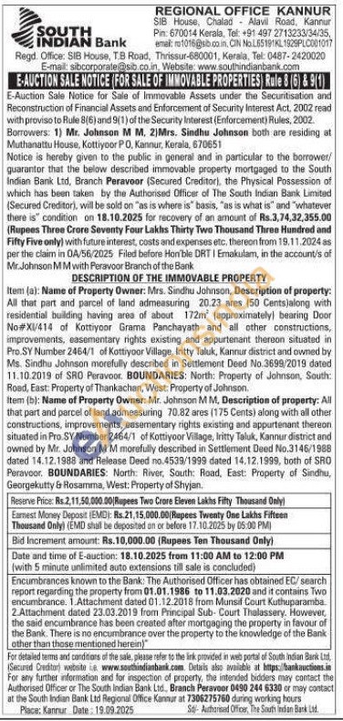 Description of property: All that part and parcel of land admeasuring 20.23 ares (50 Cents)along with residential building having area of about 172m² (approximately bearing Door No#XI/414 of Kottiyoor Grama Panchayath and all other constructions, improvements, easementary rights existing and appurtenant thereon situated in Pro.SY Number 2464/1 of Kottiyoor Village, Iritty Taluk, Kannur district and owned by Ms. Sindhu Johnson morefully described in Settlement Deed No.3699/2019 dated 11.10.2019 of SRO Peravoor. BOUNDARIES: North: Property of Johnson, South: Road, East: Property of Thankachan, West: Property of Johnson. Item (b): Name of Property Owner: Mr. Johnson MM, Description of property: All that part and parcel of land admeasuring 70.82 ares (175 Cents) along with all other constructions, improvements, easementary rights existing and appurtenant thereon situated in Pro. SY Number 2464/1 of Kottiyoor Village, Iritty Taluk, Kannur district and owned by Mr. Johnson MM morefully described in Settlement Deed No.3146/1988 dated 14.12.1988 and Release Deed no.4539/1999 dated 14.12.1999, both of SRO Peravoor, BOUNDARIES: North: River, South Road, East: Property of Sindhu, Georgekutty & Rosamma, West: Property of Shyjan