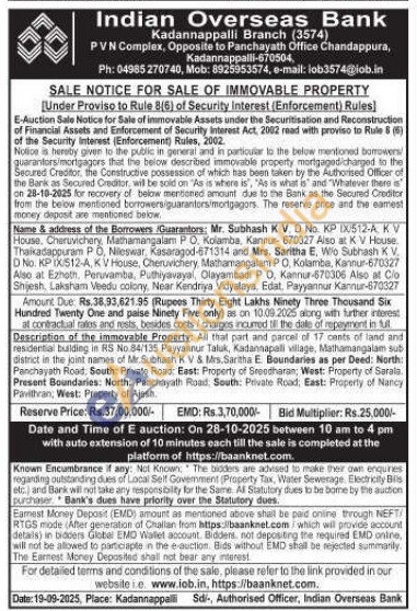 Description of the immovable Property: All that part and parcel of 17 cents of land and residential building in RS No.84/135 Payyannur Taluk, Kadannapali village, Mathamangalam sub district in the joint names of Mr.Subhash KV & Mrs.Saritha E. Boundaries as per Deed: North: Panchayath Road, South Private Road: East: Property of Sreedharan; West: Property of Sarala. Present Boundaries: North: Panchayath Road: South: Povale Road: East: Property of Nancy Paviltran, West: Property of Ajesh