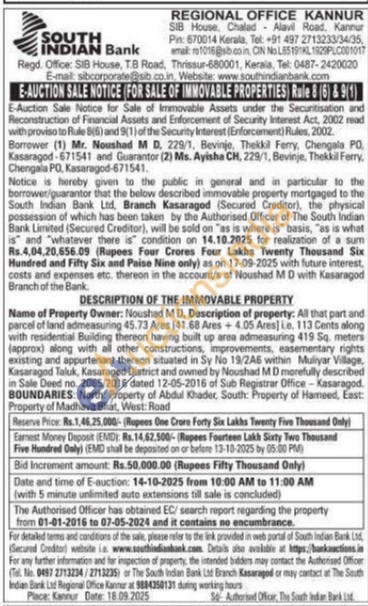 Description of property: All that part and parcel of land admeasuring 45.73 Ares (41.68 Ares +4.05 Aresie. 113 Cents allong with residential Building thereon having built up area admeasuring 419 Sq. meters (approx) along with all other constructions, improvements, easementary rights existing and appurtenant thereon situated in Sy No 19/246 within Muliyar Village, Kasaragod Taluk, Kasaragod District and owned by Noushad MD morefully described in Sale Deed no. 2065/2016 dated 12-05-2016 of Sub Registrar Office-Kasaragod BOUNDARIES: North: Property of Abdul Khader, South: Property of Hameed, East: Property of Madhav Bhat, West: Road