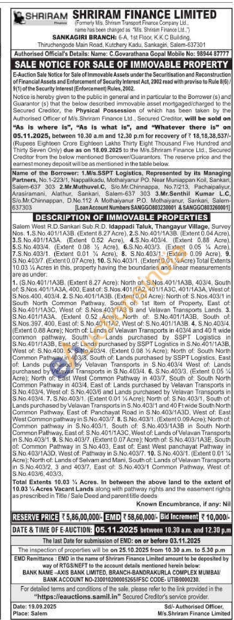 Salem West R.D. Sankari Sub.R. D. Idappadi Taluk, Thangayur Village, Survey Nos. 1.S.No.401/1A3B. (Extent 8.27 Acre), 2.S. No.401/1A3B. (Extent 0.04 Acre) 3.5. No.401/1A3A (Extent 0.52 Acre), 4.5.No.403/4. (Extent 0.88 Acre) 5.S. No.403/4, (Extent 0.08% Acre), 6.S.No.403/3. (Extent 0.05 % Acre 7.S.No.403/1. (Extent 0.01% Acre), 8. S.No.403/1. (Extent 0.09 Acre), 9. S.No.403/7 (Extent 0.07 Acre), 10. S.No.403/1. (Extent 0.01% Acre) Total Extents 10.03% Acres in this, property having the boundaries and linear measurements are as under 1. (S.No.401/1A3B. (Extent 8.27 Acre): North af: S.Nos.401/1A3B, 403/4, South of: S.Nos. 401/1A3A, 400, East of: S.Nos. 401/1A2, 401/1A3C, 401/1A3A, West of S.Nos.400, 403/4. 2. S.No.401/1A3B (Extent 0.04 Acre): North of: S. Nos. 403/1 in South North Common Pathway, South of: 1st Item of Property, East of S.No.401/1A3C, West of: S.Nos 403/1A3 B and Velavan Transports Lands. 3. S.No. 401/1A3A. (Extent 0.52 Acre); North of. S.No.401/1A3B, South of S.Nos 397, 400, East of: S. No.401/1A2, West of: S.No.401/1A3B. 4. S.No.403/4 (Extent 0.88 Acre); North of: Lands of Velavan Transports in 403/4 and 40 ft wide common pathway, South of Lands purchased by SSPT Logistics S.No. 401/1A3B, East of: Lands purchased by SSPT Logistics in S.No.401/1A3B, West of: S.No.400. 5. S.No.403/4 (Extent 0.08% Acre); North of South North Common Pathway in 403/3, South of: Lands purchased by SSPT Logistics, East of: Lands purchased by Velavan Transports in S No.403/4 West of Lands purchased by Velavan Transports in S.No.403/4. 6. S.No.403/3, (Extent 0.05% Acre); North of: East West Common Pathway in 403/7, South of South North Common Pathway in 403/4, East of Lands purchased by Velavan Transports in S.No.403/4, West of. S.No.403/6 and Lands purchased by Velavan Transports S.No.403/4. 7. S.No.403/1. (Extent 0.01% Acre); North of: S.No.403/1, South of Lands purchased by Velavan Transports in S.No. 403/1 and 40 Ft wide South North Common Pathway, East of Panchayat Road in S.No. 403/1A3D, West of. East West Common pathway in S.No.403/7. 8. S.No.403/1. (Extent 0.09 Acre), North of Common pathway in S.No.403/1, South of S.No.403/1A3B in South North Common Pathway, East of: S.No. 401/1A3C, West of: Lands of Velavan Transports in S.No.403/1. 9. S.No. 403/7 (Extent 0.07 Acre): North of: S.No.403/1A3E, South of: Common Pathway in S.No.403. East of. East West panchayat Pathway in S.No.403/1A3D, West of: Pathway in S.No. 403/7. 10. S.No. 403/1. (Extent 0.01% Acre): North of: Lands of Selvam and Mani, South of: Lands of Velavan Transports in S.No.403/2, 3 and 403/7, East of: S.No.403/1 Common Pathway, West of S.No. 403/6,403/3
