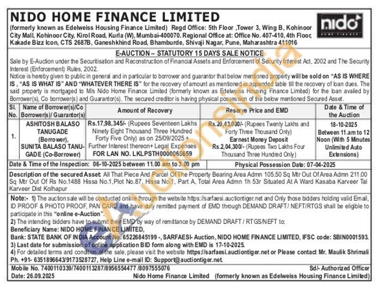 Description of the secured Asset All That Piece And Parcel Of The Property Bearing Area Admn 105.50 Sq Mtr Out Of Area Admn 211.00 Sq Mtr Out Of Rs No.1488 Hissa No.1, Plot No.87, Hissa No.1, Part A, Total Area Admn 1h 53r Situated At A Ward Kasaba Karveer Tal Karveer Dist Kolhapur