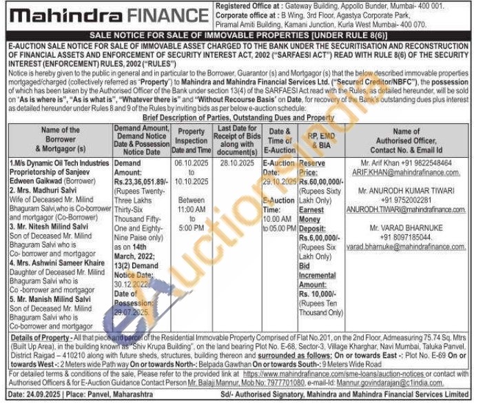 Details of Property-All that piece and parcel of the Residential Immovable Property Comprised of Flat No. 201, on the 2nd Floor, Admeasuring 75.74 Sq. Mtrs (Built Up Area), in the building known as "Shiv Krupa Building", on the land bearing Plot No. E-68, Sector-3, Village Kharghar, Navi Mumbai, Taluka Panvel, District Raigad-410210 along with future sheds, structures, building thereon and surrounded as follows: On or towards East: Plot No. E-69 On or towards West-:2 Meters wide Path way On or towards North-: Belpada Gawthan On or towards South-: 9 Meters Wide Road