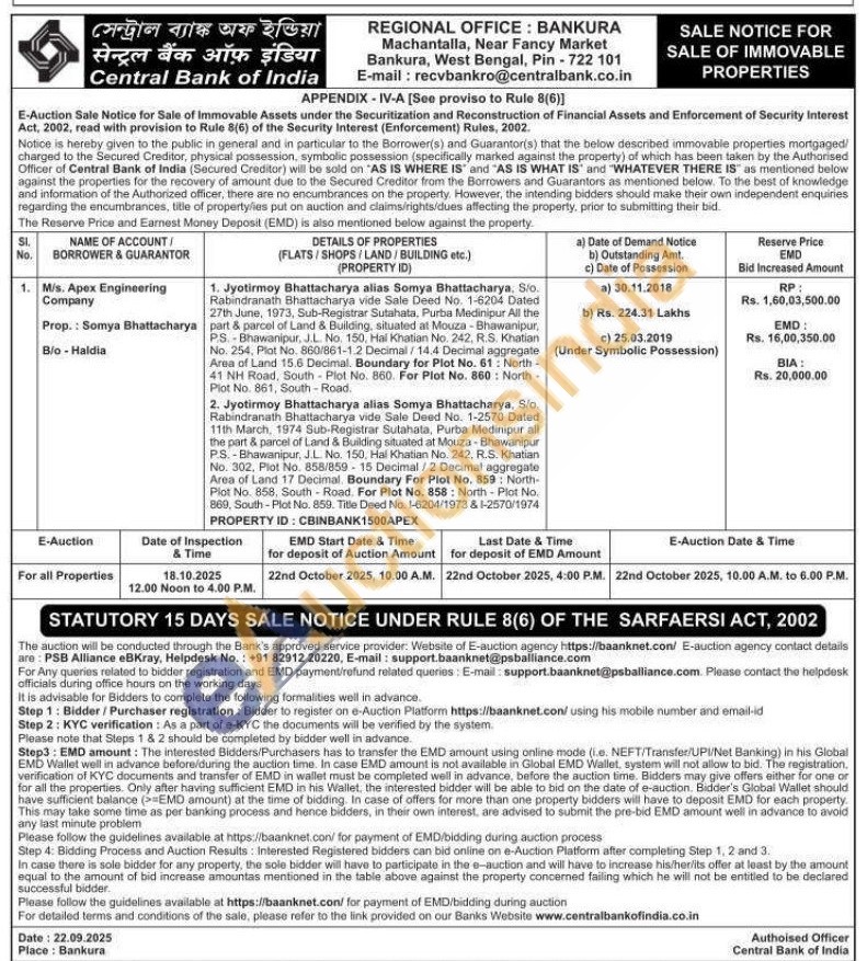 1. Jyotirmoy Bhattacharya alias Somya Bhattacharya, Sto. Rabindranath Bhattacharya vide Sale Deed No. 1-6204 Dated 27th June, 1973, Sub-Registrar Sutahata, Purba Medinipur All the part & parcel of Land & Building, situated at Mouza-Bhawanipur, PS.-Bhawanipur, J.L. No. 150, Hal Khatian No. 242, R.S. Khatian No. 254. Plot No. 860/861-1.2 Decimal/14.4 Decimal aggregate Area of Land 15.6 Decimal. Boundary for Plot No. 61: North-41 NH Road, South Plot No. 860. For Plot No. 860: North-Plot No. 861, South-Road.2. Jyotirmoy Bhattacharya alias Somya Bhattacharya, S/o Rabindranath Bhattacharya vide Sale Deed No. 1-2570 Dated 11th March, 1974 Sub-Registrar Sutahata, Purba Medinipur all the part & parcel of Land & Building situated at Mouza-Bhawanipur P.S.-Bhawanipur, J.L. No. 150, Hal Khatian No. 242. R.S. Khatian No. 302. Plot No. 858/859-15 Decimal/2 Decimal aggregate Area of Land 17 Decimal. Boundary For Plot No. 859: North-Plot No. 858, South Road. For Plot No. 858: North-Plot No. 869, South-Plot No. 859. Title Deed No. 1-6204/1973 & 1-2570/1974 PROPERTY ID: CBINBANK1500APEX