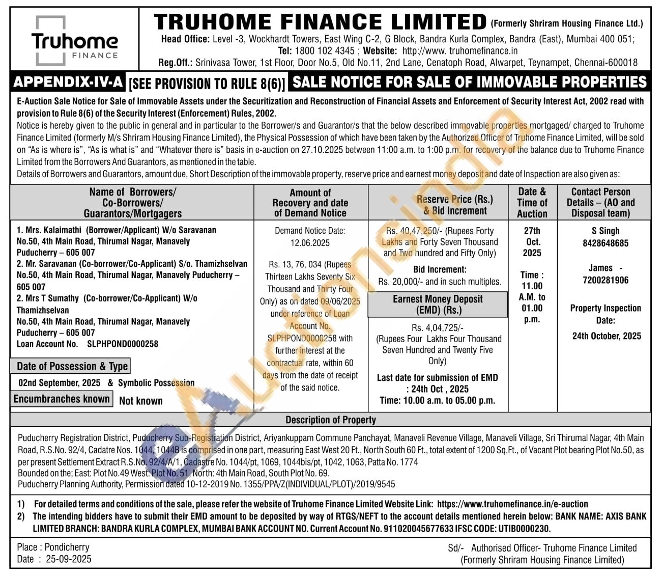 Puducherry Registration District, Puducherry Sub-Registration District, Ariyankuppam Commune Panchayat, Manaveli Revenue Village, Manaveli Village, Sri Thirumal Nagar, 4th Main Road, R.S.No. 92/4, Cadatre Nos. 1044, 1044B is comprised in one part, measuring East West 20 Ft., North South 60 Ft., total extent of 1200 Sq.Ft., of Vacant Plot bearing Plot No.50, as per present Settlement Extract R.S.No. 92/4/A/1, Cadastre No. 1044/pt, 1069, 1044bis/pt, 1042, 1063, Patta No. 1774 Bounded on the; East: Plot No.49 West: Plot No. 51, North: 4th Main Road, South Plot No. 69. Puducherry Planning Authority, Permission dated 10-12-2019 No. 1355/PPA/Z (INDIVIDUAL/PLOT)/2019/9545