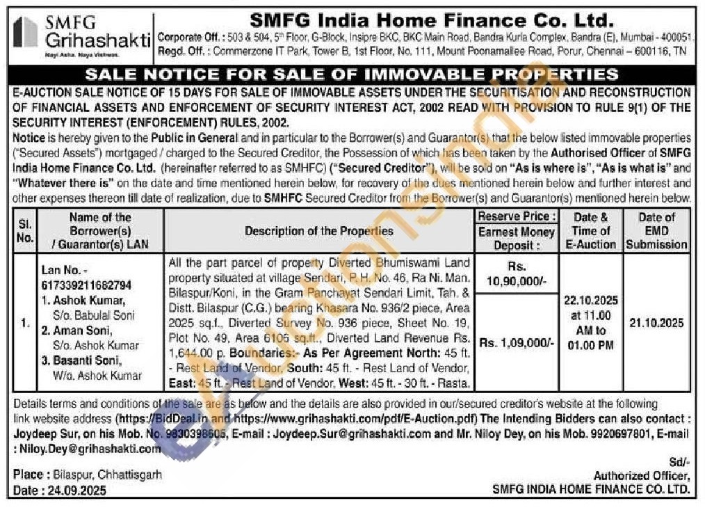 All the part parcel of property Diverted Bhumiswami Land property situated at village Sendari, P. H. No. 46, Ra Ni. Man. Bilaspur/Koni, in the Gram Panchayat Sendari Limit, Tah. & Distt. Bilaspur (C.G.) bearing Khasara No. 936/2 piece, Area 2025 sq.1., Diverted Survey No. 936 piece, Sheet No. 19, Plot No. 49, Area 6106 sq.ft., Diverted Land Revenue Rs. 1,644.00 p. Boundaries: As Per Agreement North: 45 ft. Rest Land of Vendor, South: 45 ft. Rest Land of Vendor, East: 45 ft. - Rest Land of Vendor, West: 45 ft. - 30 ft. - Rasta