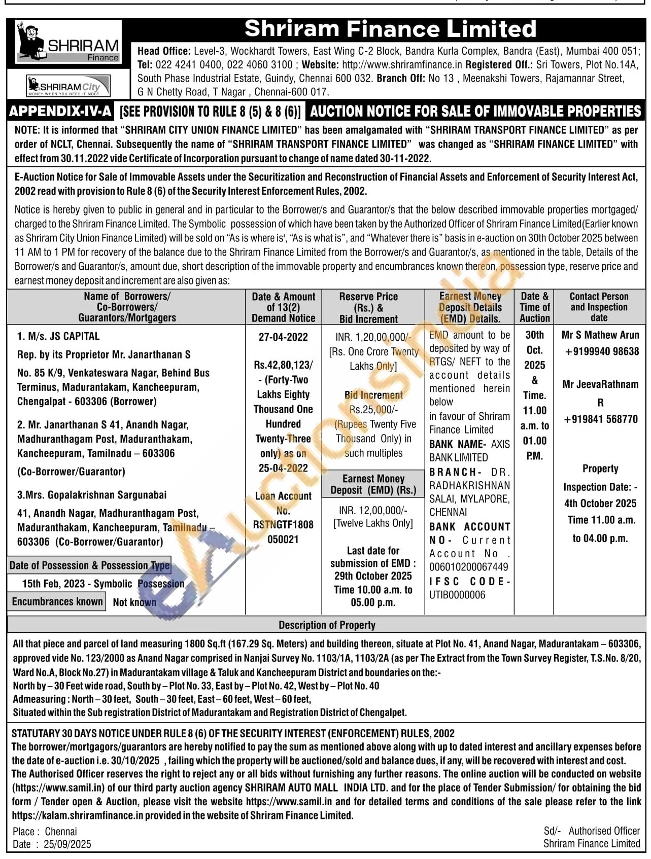 All that piece and parcel of land measuring 1800 Sq.ft (167.29 Sq. Meters) and building thereon, situate at Plot No. 41, Anand Nagar, Madurantakam-603306, approved vide No. 123/2000 as Anand Nagar comprised in Nanjai Survey No. 1103/1A, 1103/2A (as per The Extract from the Town Survey Register, T.S.No. 8/20, Ward No.A, Block No.27) in Madurantakam village & Taluk and Kancheepuram District and boundaries on the:- North by-30 Feet wide road, South by-Plot No. 33, East by-Plot No. 42, West by Plot No. 40 Admeasuring: North-30 feet, South-30 feet, East-60 feet, West-60 feet,