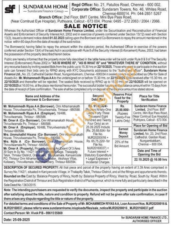 DESCRIPTION OF SECURED PROPERTY: All that piece and parcel of the property having an extent of 3.39 Ares comprised in Survey No, 1142/1, situated in Kaniyarcode Village, in Thalapilly Taluk, Thrissur District, and all the fittings and appurtenants thereto, Bounded on the East by: Balance Property of Rincy, North by: Balance Property of Rincy, West by: Road, South by: Road. Within the Registration District of Thrissur and Sub Registration district of Pazhayannur, which is more fully and particularly described in the Sale Deed No. 1363/2015