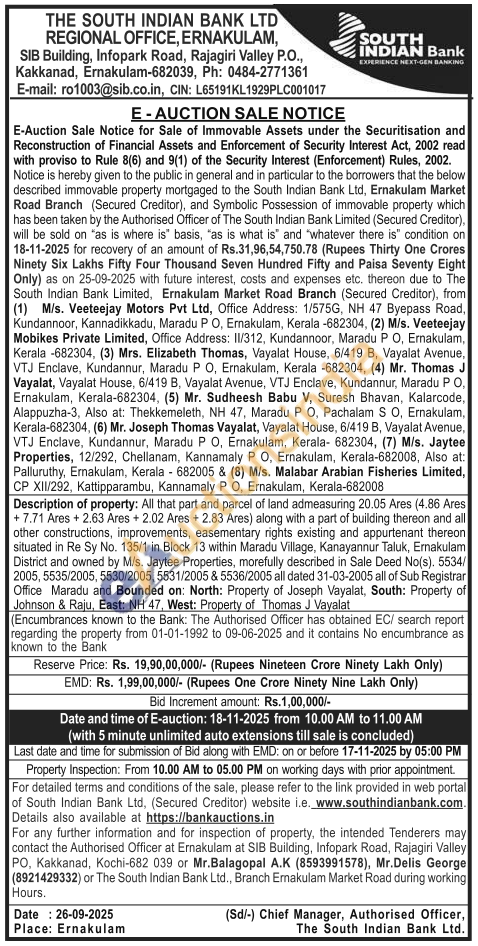 All that part and parcel of land admeasuring 20.05 Ares (4.86 Ares + 7,71 Ares + 2.63 Ares + 2.02 Ares + 2.83 Ares) along with a part of building thereon and all other constructions, improvements, easementary rights existing and appurtenant thereon situated in Re Sy No. 135/1 in Block 13 within Maradu Village, Kanayannur Taluk, Ernakulam District and owned by M/s. Jaytee Properties, morefully described in Sale Deed No(s). 5534/2005, 5535/2005, 5530/2005, 5531/2005 & 5536/2005 all dated 31-03-2005 all of Sub Registrar Office Maradu and Bounded on: North: Property of Joseph Vayalat, South: Property of Johnson & Raju, East: NH 47, West: Property of Thomas J Vayalat
