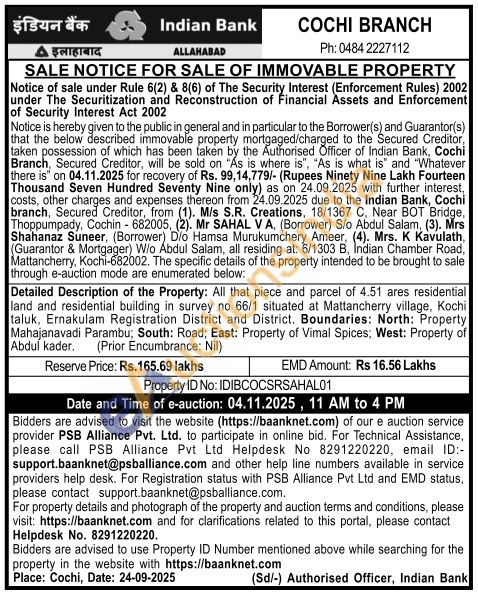 All that piece and parcel of 4.51 ares residential land and residential building in survey no 66/1 situated at Mattancherry village, Kochi taluk, Ernakulam Registration District and District. Boundaries: North: Property Mahajanavadi Parambu; South: Road; East: Property of Vimal Spices; West: Property of Abdul kader. (Prior Encumbrance: Nil)