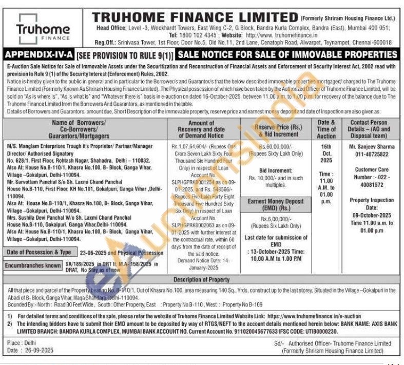 All that piece and parcel of the Property bearing No. B-110/1, Out of Khasra No. 100, area measuring 140 Sq.. Yrds, construct up to the last storey, Situated in the Village-Gokalpuri in the Abadi of B-Block, Ganga Vihar, Illaqa Shahdara, Delhi-110094. Bounded By:-North: Road 30 Feet Wide, South: Other Property, East Property No B-110, West Property No B-109