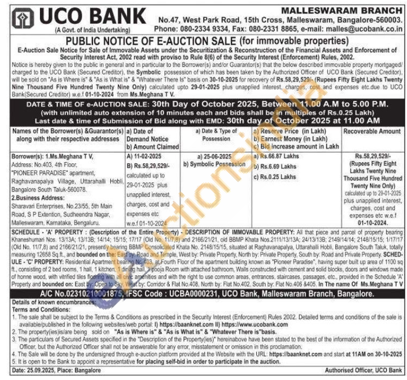 All that piece and parcel of property bearing Khaneshumari Nos. 13/13A; 13/138; 14/14; 15/15; 17/17 (Old No. 11/7,8) and 2166/21/21, old BBMP Khata Nos 2111/13/13A: 24/13/138: 2149/14/14; 2148/15/15; 1/17/17 (Old No. 11/7,8) and 2166/21/21, presently bearing BBMP Consolidated Khata No. 2148/15/15, situated at Raghavanapalya, Uttarahalli Hobli, Bangalore South Taluk, totally measuring 12858 Sq.ft., and bounded on the: East by: Road and Temple, West by: Private Property, North by: Private Property, South by: Road and Private Property. SCHED-ULE 'C' PROPERTY: Residential Apartment bearing No.403, at Fourth Floor of the apartment building known as "Pioneer Paradise", having super built up area of 1100 sq ft., consisting of 2 bed rooms, 1 hall, 1 kitchen, 1 dining hall, 1 pooja Room with attached bathroom, Walls constructed with cement and solid blocks, doors and windows made of honne wood, with vitrified tilles flooring with all civic amenities and with the right to use common areas, entrances, staircases, passages, etc., provided in the Schedule 'A' Property and bounded on: East by. Open to Sky, West by: Corridor & Flat No.408, North by: Fiat No.402, South by: Flat No.406 8405. In The name Of Ms.Meghana TV