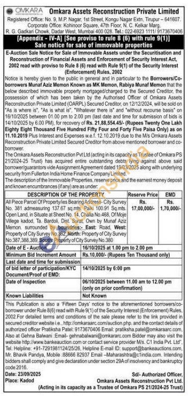 All Piece Parcel Of Property/les Bearing Address-City Survey No. 381 admeasuring 137.67 sq.mts. Paiki 100.91 Sq mts. Open Land, in Situate at Sheet No. 14, Chalta No.468, Of Moje Villege kadod. Ta. Bardoli, Dist. Surat, Own by Munaf Aziz Memon, surrounded by boundries: East: Road, West: Property of City Survey No. 382, North: Property of City Survey No.387,388,389, South: Property of City Survey No.380
