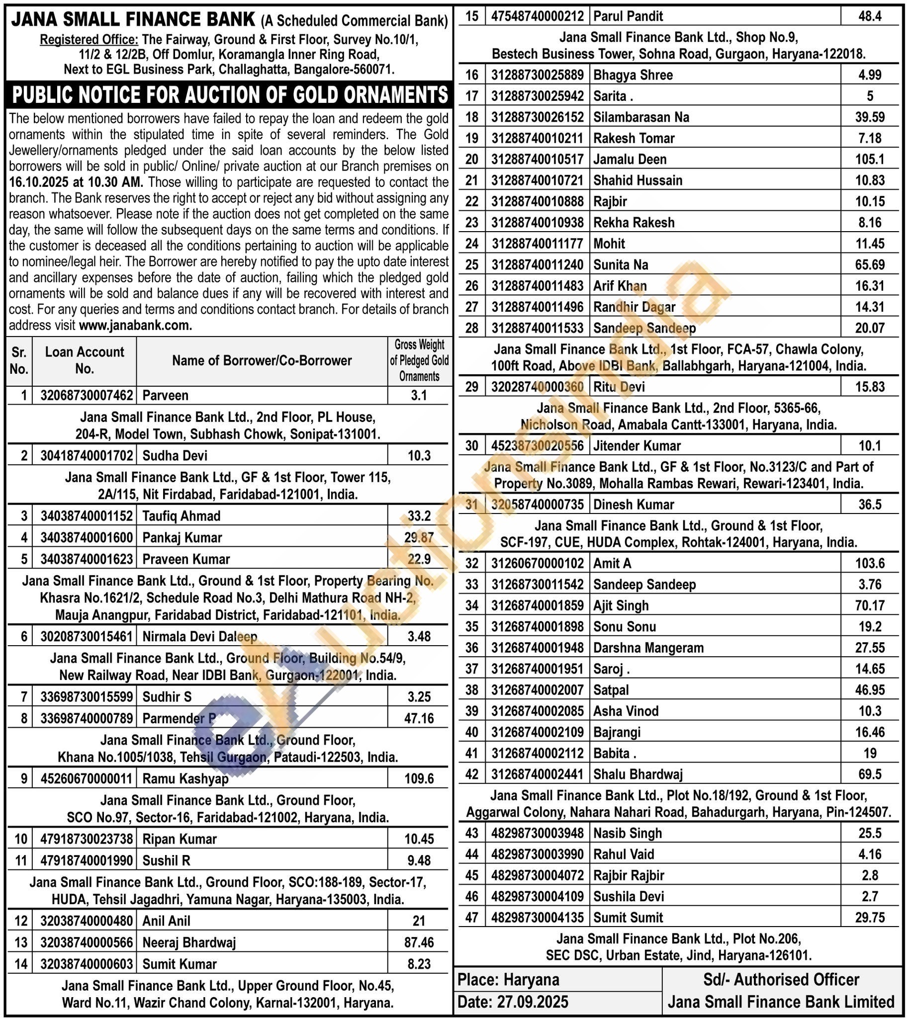 Jana Small Finance Bank Gold Auctions Auction in Sonipat