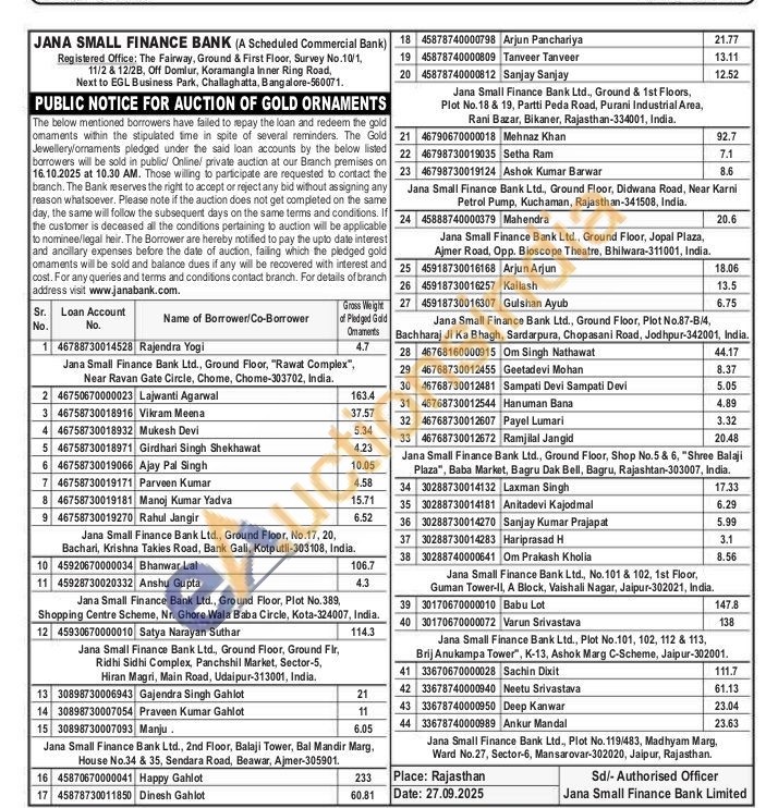 Jana Small Finance Bank Gold Auctions Auction in Udaipur