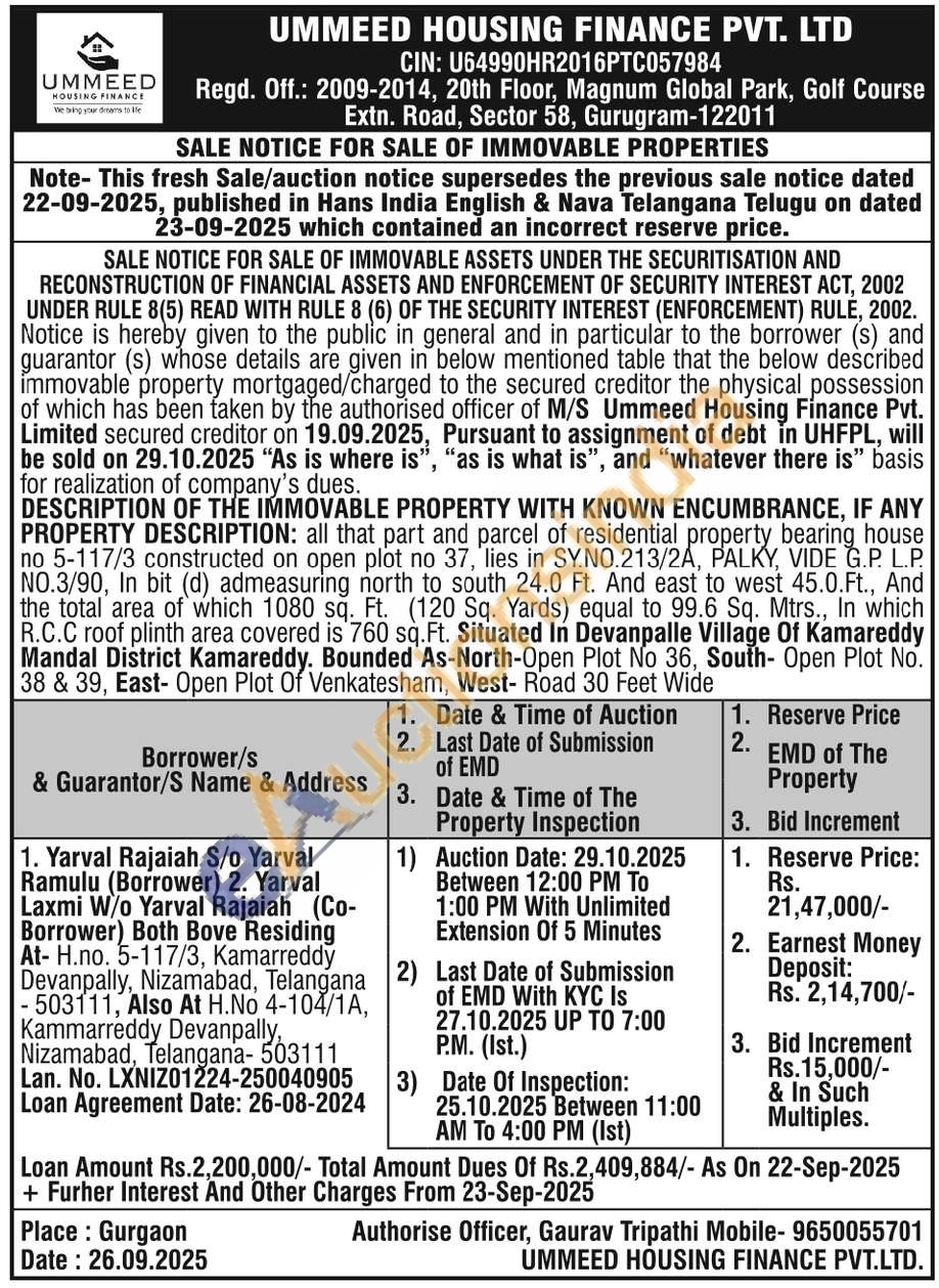 all that part and parcel of residential property bearing house no 5-117/3 constructed on open plot no 37, lies in SY.NO.213/2A, PALKY, VIDE G.P. L.P. NO.3/90, In bit (d) admeasuring north to south 24.0 Ft. And east to west 45.0.Ft., And the total area of which 1080 sq. Ft. (120 Sq. Yards) equal to 99.6 Sq. Mtrs., In which R.C.C roof plinth area covered is 760 sq. Ft. Situated In Devanpalle Village Of Kamareddy Mandal District Kamareddy. Bounded As-North-Open Plot No 36, South- Open Plot No. 38 & 39, East- Open Plot Of Venkatesham, West- Road 30 Feet Wide