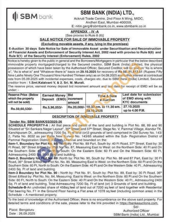 All that piece and parcel of the land and building in Plot No. 88, 89 and 90 Situated at "Sri Sankara Nagar Layout", 36th Street and 37th Street, Stage No. V, Pammal Village, Alandur TK, Kanchipuram Dt., admeasuring 7200 Sq. Ft of land (or)3 grounds of land comprised in Old Survey No. 143/2, Patta No. 8032 as per Patta New Survey No. 143/65 situated within the Sub-Registration District of Pammal Registration District of South Chennai and bounded on the: Item-1, Boundary for Plot No. 88: North by: Plot No. 89 Part, South by: 40 Ft Road, 37 Street, East by: 30 Ft Road, 36th Street &West by: Plot No. No. 87, Measuring East to West: on the Northern Side: 40 Ft and On the Southern Side: 40 Ft, North to South: On the Eastern Side: 60 Ft and On the Western Side: 60 Ft, Admeasuring 2400 Sq. Ft of land and building.