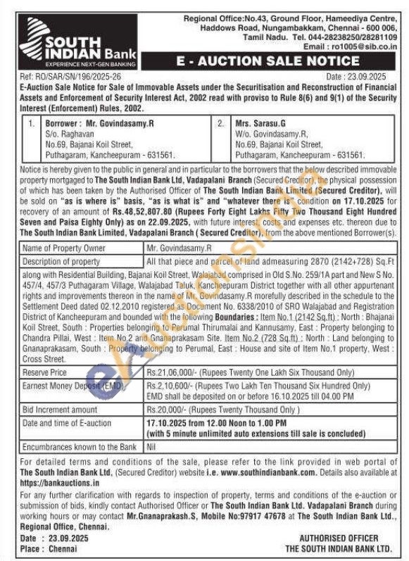 All that piece and parcel of land admeasuring 2870 (2142+728) Sq.Ft along with Residential Building, Bajanai Koil Street. Walajabad comprised in Old S.No. 259/1A part and New S No. 457/4, 457/3 Puthagaram Village, Walajabad Taluk, Kancheepuram District together with all other appurtenant rights and improvements thereon in the name of Mr. Govindasamy R morefully described in the schedule to the Settlement Deed dated 02.12.2010 registered as Document No. 6338/2010 of SRO Walajabad and Registration District of Kancheepuram