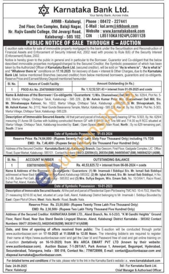 Description of Immovable Secured Assets: All the part and parcel of Residential Open Plot bearing TMC NO. 10-4-70/2, Ward No. 21 measuring 9216.00 sq feet, situated at Lunje Galli, Aland, Kalaburagi District belonging to Mr. Imamsab 1. Siddiqui Bounded by East: Open Plot of Others, West: Nala, North: Road, South: Nala