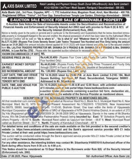 All that residential cum commercial property situated at Revenue Ward No.3, Block No.3. Municipal Ward No.6, New Municipal Ward No.10, NTS No.220,222 Present Assessment No. 173023915 173023916, New Assessment No. 58079, 58080, bearing D.No. 11-63-49, 11-63-50, Brahmin Street, One town within the limits of Vijayawada Municipal Corporation and within the limits of SRO of Vijayawada of NTR District Krishna District, in an extent of 272 Sq. Yds (Registered gift Deed No.3160/2009 Dt: 24-08-2009 SRO at Vijayawada, Stands in the name of Mr. Shanka Aruna, Wio Mr.Chakradhara Venakta Padmanabha Prasad) being bounded by: East: "B" Schedule Property and othens Property-49.10 ft. South: Muncipal Raod called as Uppuluri Van Street 48.6 ft. West: Municipal Road called as Brahmin Street 50.7 ft. North: Property of Kandukuri Chenchaiah 49"ft