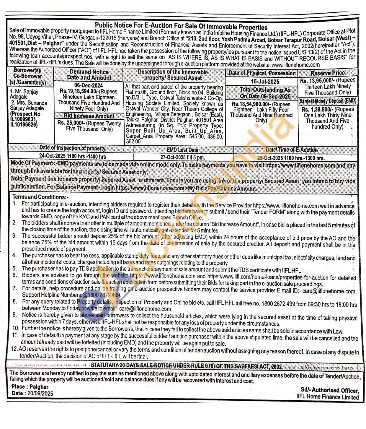 All that part and parcel of the property bearing Flat no.06, Ground floor, Block no.04, Building no.D/3, L Type, Ostwal Takshsheela-2 Co-Op. Housing Society Limited, Society known as Ostwal Wonder City, Near Theem College of Engineering, Village Betegaon, Boisar (East), Taluka Palghar, District Palghar, 401501 Area Admeasuring (in Sq. Ft.): Property Type: Super_Built_Up_Area, Built_Up_Area, Carpet Area Property Area: 545.00, 436.00, 362.00