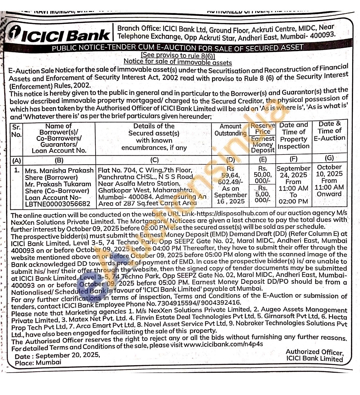 Flat No. 704, C Wing, 7th Floor, Panchratna CHSL., N S S Road, Near Asalfa Metro Station, Ghatkopar West, Maharashtra, Mumbai-400084. Admeasuring An Area of 287 Sq.feet Carpet Area