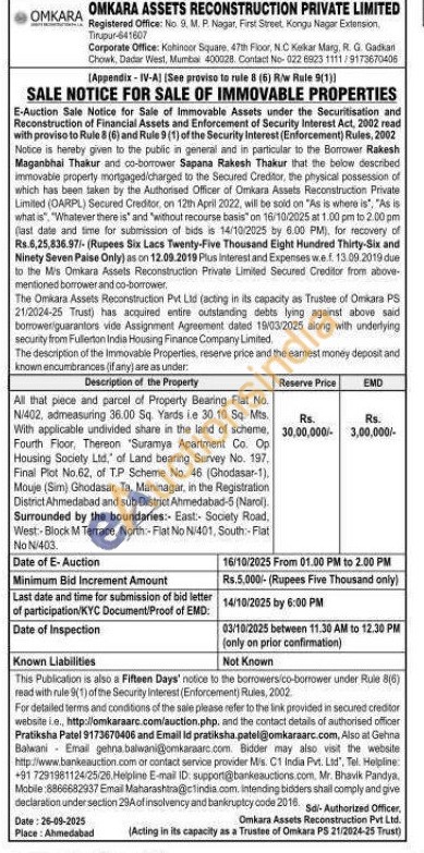 All that piece and parcel of Property Bearing Flat No. N/402, admeasuring 36.00 Sq. Yards ie 30.10 Sq. Mts. With applicable undivided share in the land of scheme. Fourth Floor, Thereon "Suramya Apartment Co. Op Housing Society Ltd. of Land bearing Survey No. 197. Final Plot No.62, of T.P Scheme No. 46 (Ghodasar-1), Mouje (Sim) Ghodasar, Ta. Maninagar, in the Registration District Ahmedabad and sub District Ahmedabad-5 (Narol), Surrounded by the boundaries: East: Society Road. West-Block M Terrace, North Fiat No N/401, South-Flat No N/403.
