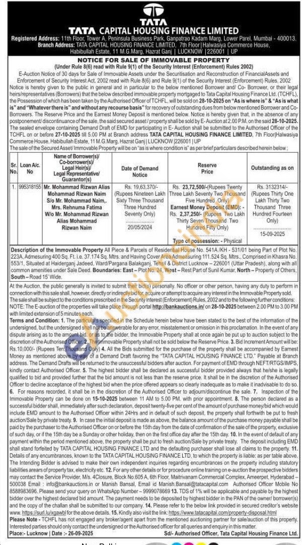 Description of the Immovable Property All Piece & Parcels of Residential House No. 5414/KH-531/01 being Part of Plot No. 223A Admesuring 400 Sq. FL. La. 37.174 Sq. Mtrs. and Having Cover Area Admeasuring 111.524 Sq. Mtrs. Comprised in Khasra No. 553/1, Situated at Haiderganj Jadeed, Ward/Pargana Balakganj, Tehsil & District Lucknow-226001 (Uttar Pradesh), along with all common amenities under Sale Deed. Boundaries: East-Plot No. 24, West-Rest Part of Sunil Kumar, North-Property of Others. South-Road 15 Wide