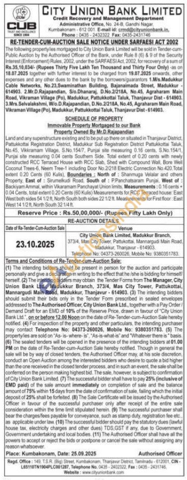 Land and any superstructure existing and to be put up there on situated in Thanjavur District, Pattukkottai Registration District, Madukkar Sub Registration District Pattukkottai Taluk No. 45. Vikkramam Village. S.No 154/7, Punjai site measuring 0.16 cents. S.No. 154/1 Punjai site measuring 0.04 cents Southem Side. Total extent of 0.20 cents with newly constructed RCC Terraced House with RCC Slab, Shed with Compound Wall, Bore Well Coconut Trees-6, Neem Tree-1 including Door No 2/218 Electric Connection No 420. Total extent 0.20 Cents (60 Kulis), Boundaries: North of Shanmuga Velalar and others Property, East of Sirumelkudi Road, South of P.Panchatsaram Punjai, West of: Backiyam Ammal, within Vikanamam Panchayat Union limits, Measurements:0.16 cents 10.04 Cents, total extent 0.20 Cents (60 Kulis) Measurements for RCC Terraced house: East West both sides 54 1/2 ft, North South both sides 22 1/2 ft. Measurements for First floor: East West 14 1/2 ft. North South 32 1/4 ft.