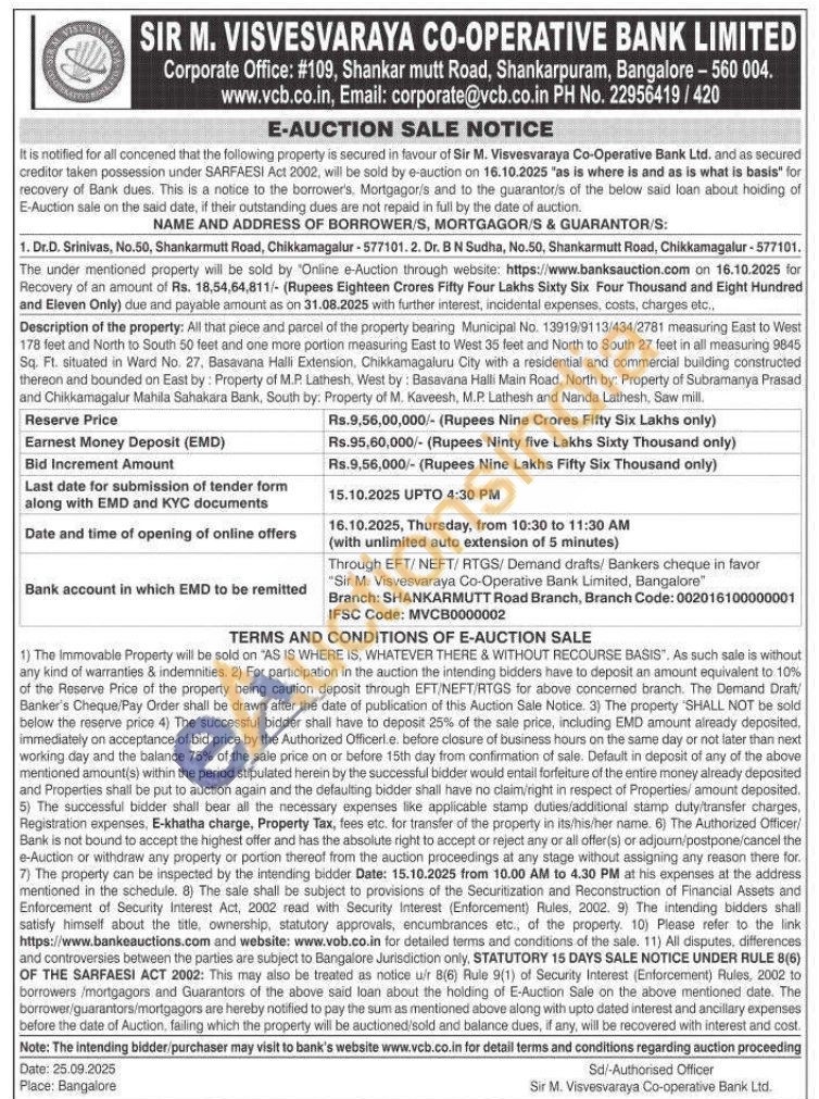 Description of the property: All that piece and parcel of the property bearing Municipal No. 13919/9113/434/2781 measuring East to West 178 feet and North to South 50 feet and one more portion measuring East to West 35 feet and North to South 27 feet in all measuring 9845 Sq. Ft. situated in Ward No. 27, Basavana Halli Extension, Chikkamagaluru City with a residential and commercial building constructed thereon and bounded on East by: Property of M.P. Lathesh, West by: Basavana Halli Main Road, North by: Property of Subramanya Prasad and Chikkamagalur Mahila Sahakara Bank, South by: Property of M. Kaveesh, M.P. Lathesh and Nanda Lathesh, Saw mill.