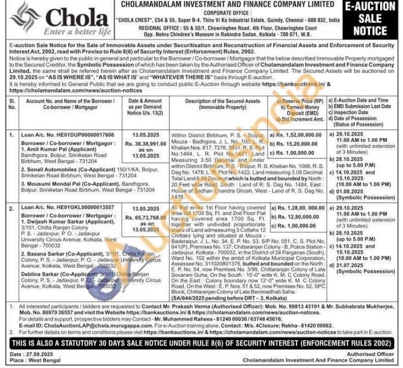 Within District Birbhum, P. S. Bolpur, Mouza Badhgora, J. L. No. 100, L. R. Khatian Nos. 817, 7276, 3931, R. S. Plot No.1484, L. R. Plot No.1421. Land Measuring 3.50 Decimal and underwithin District Birbhum, P. S. Bolpur, R. S. Khatian No. 1066, R. S Dag No. 1478. L. R. Plot No. 1422. Land measuring 3.08 Decimal. Total Land 6.58 Decimal which is butted and bounded by North: 20 Feet wide Road, South Land of R. S. Dag No. 1484, East: House of Sadhan Chandra Ghosh, West-Land of R. S. Dag No. 1478.