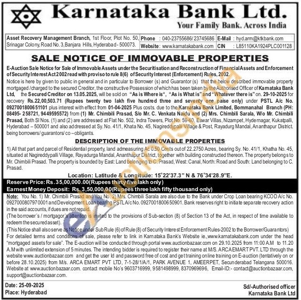 1) All that part and parcel of Residential property, land admeasuring Ac 0.50 Cents out of 22.2750 Acres, bearing Sy. No. 41/1, Khatha No. 45, situated at Nagireddypalli Village, Rayadurga Mandal, Ananthapur District, together with building constructed thereon. The property belongs to Mr. Chimbili Prasad. The property is bounded by East: Land belonging to C. Prasad, West: Canal, North: Road and South: Land belonging to C. Prasad.