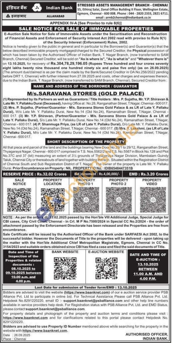 All that piece and parcel of the land and the buildings bearing New Door No.29/1 to 29/12, Ranganathan Street, Thyagaraya Nagar, Chennai-600017 comprised in T.S. Nos. 5562/2 and T.S. No. 5567 in Block No. 128 and Plot No.37C and 37 (bit) measuring an extent of 3 1/2 grounds of Thyagaraya Nagar Division, Mambalam Guindy Taluk, Chennai City or thereabouts of land together with building thereon. Situated within the Registration District of Chennai South and Sub Registration District of T. Nagar. The owner of the property is Late Mr. Y. Pallaku Durai. Prior Encumbrance on Property: NIL. PROPERTY ID No.: IDIB65484473518