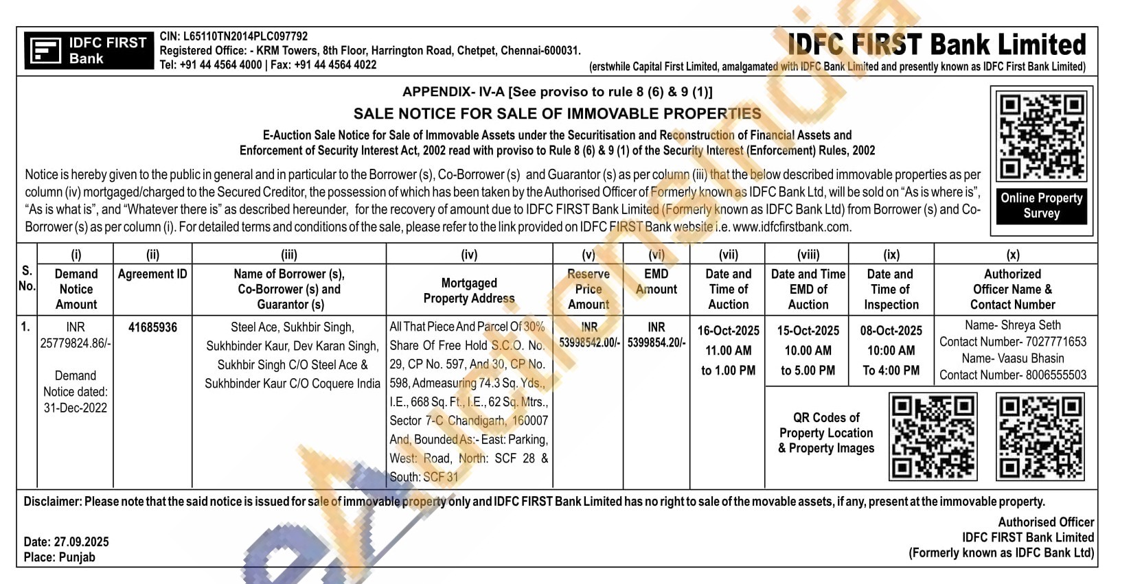 All That Piece And Parcel Of 30% Share Of Free Hold S.C.O. No. 29, CP No. 597, And 30, CP No. 598, Admeasuring 74.3 Sq. Yds., I.E., 668 Sq. Ft., I.E., 62 Sq. Mtrs., Sector 7-C Chandigarh, 160007 And, Bounded As:-East: Parking, West: Road, North: SCF 28 & South: SCF 31