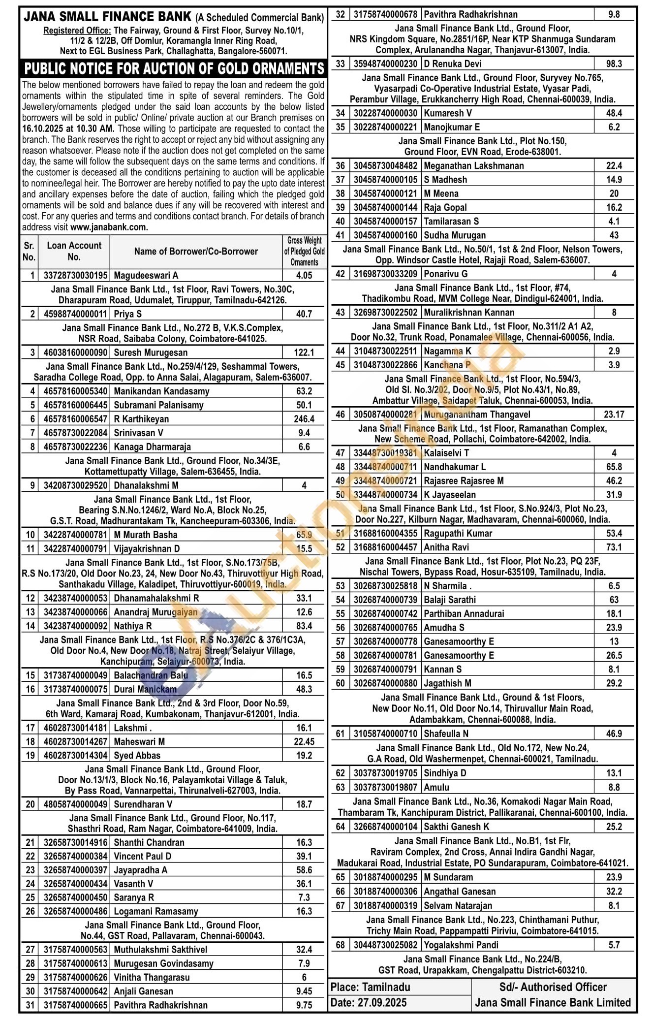 Jana Small Finance Bank Gold Auctions Auction in Tiruppur