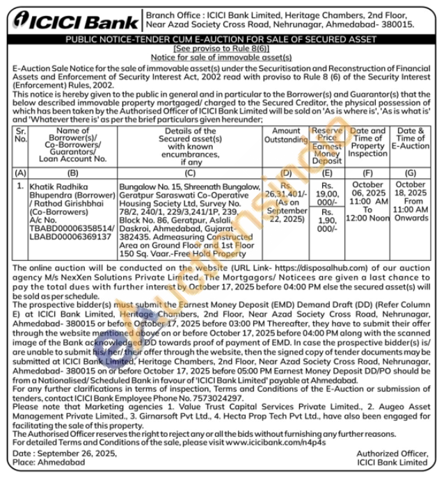 Bungalow No. 15, Shreenath Bungalow, Geratpur Saraswati Co-Operative Housing Society Ltd, Survey No. 78/2, 240/1, 229/3,241/1P, 239, Block No. 86, Geratpur, Aslali, Daskroi, Ahmedabad, Gujarat-382435. Admeasuring Constructed Area on Ground Floor and 1st Floor 150 Sq. Vaar.-Free Hold Property